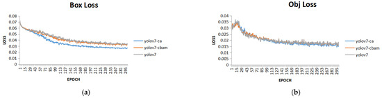 According to the calculation method described in Table 1, we conducted ablation experiments on three different versions of the YOLOv7 model: YOLOv7, YOLOv7 with CBAM, and YOLOv7 with CA attention mechanisms, respectively. The results obtained are shown in Table 2, and as a reference object, we selected the experimental results of Yolov3 used in [36] for comparative observation, which are also given in Table 2.