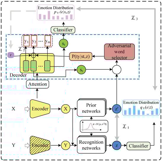 Our model overview is shown in Figure 1, which is built on the CVAE framework [34]. The encoder codes the input and response respectively and acts as the input of the identification network to obtain the latent variable z. The classifier performs emotion recognition for z. The perturbation word selector predicts the type of generated words according to z and decoder hidden state and controls the addition of perturbation. At the same time, emotion recognition is carried out on the decoder-generated response. By making the response’s emotion fit the real response’s emotion distribution respectively, the disturbance factor r is dynamically constrained, so that the generated response has similar emotion to the real response. The perturbation factor is applied to the word embedding of to influence the decoding, so as to achieve the goal of enhancing the diversity of response.