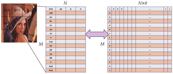 M × N (in this study, we used a size of 16 × 4 pixels) and shuffling the content of each sub-image individually. This approach allowed for a more efficient generation of limited new locations for each bit number. The gray values of each pixel in the sliding window were transformed from decimal to binary, creating an