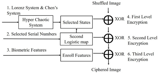 The shuffling images had been obtained during the preceding stages, and then the diffusion step, which constituted the encryption, could be executed. In this step, a three-level encryption process was performed, as shown in