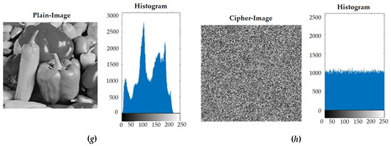 In the classic two-stage encryption system, the first step was to shuffle. In the process of rearrangement, we transferred the image to the 8-bit binary system for rearrangement. Then, we set the gray value of the image back to 10 in the carry system, which could also be changed by observing the image with the naked eye and statistically analyzing its pixel composition. The second stage was diffusion. In this stage, we applied XOR to the image through the hyper-chaotic system, along with the value generated by the unimodal mapping, which directly changed the pixel values due to the pseudo-random system we used. Therefore, the values we had generated were uniformly randomly distributed, and the encrypted results also showed uniformly random results, which could also be obtained by observing the image with the naked eye and performing a statistical analysis of the gray values. Next, in order to ensure that the encryption system was sufficient, we calculated and encrypted photos with different structures and then observed and analyzed the results. We used the standard test chart of image processing. The source of the images used was a total of three sets of data as a comparison. The images were Lena, F-16, Mandrill, and Peppers. The simulation results are provided in