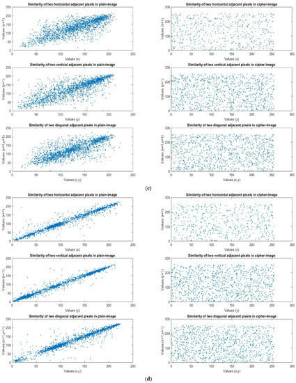 Figure 11. The purpose of the shuffle was to eliminate the relationships between adjacent pixels, so that the information of the plain image would remain hidden. We analyzed the correlations between two adjacent pixels in three directions. When the correlation was lower, the relationship between the pixels was weaker, and the effect of the rearrangement and encryption was better. The three directions were vertical, horizontal, and diagonal.