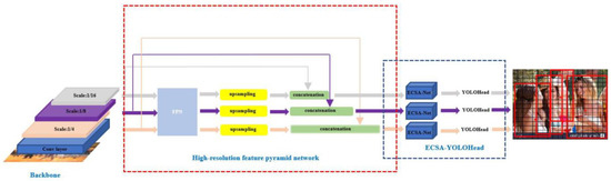 This work suggests a high-resolution feature pyramid structure to overcome the aforementioned issues, and the output feature maps of the feature pyramid are upsampled. The shallow feature map and the up-sampled high-resolution feature map are then merged once more for feature fusion. Although the shallow feature map of pedestrians provides less in-depth semantic data, it allows the adjacent sub-features to incorporate more specific data with a higher degree of partitioning from the lower-level features. While increasing the variability between adjacent features in the feature pyramid, the higher-level semantic information of the deeper features is preserved. The centroids of the highly overlapping pedestrians fall as much as feasible into distinct sub-feature regions by raising the resolution of the feature maps. The high-resolution feature pyramid structure can improve the ability of the network to extract the features of the obscured pedestrians and reduce the likelihood of missed and false detection of the obscured pedestrians because the appearance features of the obscured pedestrians originate from their limited visible pixel areas, and the shallow feature maps have smaller sensory fields and contain more detailed information than the deep feature maps.