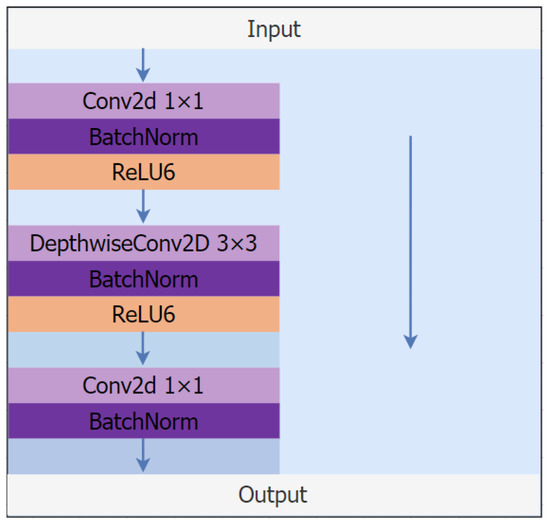 The depthwise separable convolutional block network’s structure is depicted in Figure 4. The Mobilenet series network is mostly utilized to reduce the number of parameters needed by the depthwise separable convolutional blocks. Assuming a convolutional layer with 3 × 3 convolutional kernels, 16 input channels, and 32 output channels, the process of feature extraction would first involve traversing each of the 16 feature channels with 32 convolutional kernels of size 3 × 3, followed by the output of a feature map with 32 feature channels, and 16 × 32 × 3 × 3 = 4608. Following the deep separable convolution block, we first traverse 16 feature channels of the input feature map with 16 convolution kernels of size 3 × 3, resulting in 16 feature profiles, and then we traverse 32 feature channels with 32 convolution kernels of size 1 × 1, resulting in the output feature map with 32 feature channels, which is then fused with the residual edges. This procedure requires 16 × 3 × 3 + 16 × 32 × 1 × 1 = 656 parameters in total. By comparing the two sets of data, we can see that the deep separable convolutional block drastically lowers the number of model parameters while increasing the network’s processing performance.