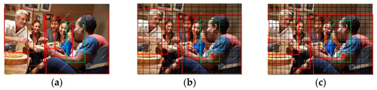 Difficulty in detecting pedestrians. (a) High overlap of six people; (b) the two strongly overlapping individuals on the right both have centroids that fit into the same grid; and (c) the centers of the two nearly identical individuals on the right fit into several grids.