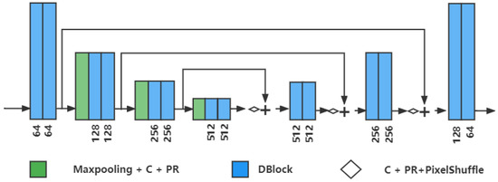 IDM is proposed to integrate the outputs from IIP and NEP. It is the U-Net-based network shown in Figure 2. DBlock in IDM is the basic feature extraction block, and PixelShuffle is the upsampling method based on the efficient sub-pixel convolution [31]. IDM outputs the final estimated noise and then obtains the denoised image via residual subtraction. loss is used as the loss function of and ground-truth clean image :