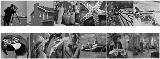 DIV2K [32] is commonly used in image processing; it contains 800 images for training, 100 for validation, and 100 for testing. We used the training set of DIV2K to train CDN. For testing, we used gray-scale image datasets Set12 [5] and BSD68 [33] and color-scale image datasets Set5 [34] and Kodak24 [35]. Figure 3 shows images of Set12, which contains C.man, House, Peppers, etc. Images in these datasets are all clean and their corresponding synthetic noisy images are generated by adding AWGN. We refer to the AWGN generation algorithm from [5], in which the noise level is determined by the standard deviation . Three noise levels, , , and , were chosen to train and test the CDN.