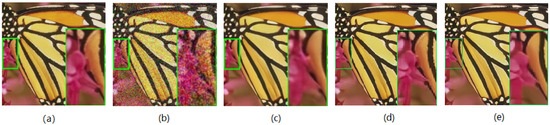 Denoising result of Butterfly from Set5 at noise level . (a) Clean image, (b) noisy image, (c) VDN, (d) NHNet, (e) CDN.