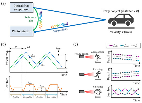 A conceptual diagram of FMCW Lidar. (a) The work diagram of FMCW Lidar. (b) Beat frequency of the reference signal (green) and sample signal (blue). (c) Beat frequency over time in the different moving cases, the blue and purple circles represent the measured peak beat frequencies [30].