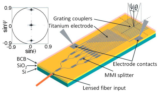 The optical phased array consists of 16 parallel grating couplers spaced 2 μm apart. θ: outcoupling angle along the waveguide axis. ψ: outcoupling angle perpendicular to the waveguide axis. The inset shows the far-field image [34].