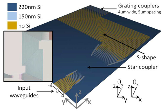 - Van Acoleyen, K.; Bogaerts, W.; Baets, R. Two-Dimensional Dispersive Off-Chip Beam Scanner Fabricated on Silicon-on-Insulator. IEEE Photonics Technol. Lett. 2011, 23, 1270–1272. [Google Scholar] [CrossRef]