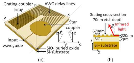 (a) Two-dimensional beam scanner on SOI. A high-order grating is used in the ϕ direction and a low-order grating is used in the θ direction. (b) Cross-section of the grating coupler array. The SOI wafer has a 2 μm buried oxide layer and a 220 nm silicon top layer [39].