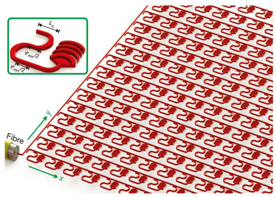 In 2013, J. Sun et al., from MIT reported a two-dimensional large-scale nano-antenna phased array fabricated on a silicon wafer [55]. The research group integrated 64 × 64 (4096) optical nano-antennas densely on a 576 μm × 576 μm silicon wafer, which was the densest silicon-based optical phased array at that time. The system’s superior robustness and compatibility with CMOS technology enable all nano-antennas to be integrated on such a chip size. The schematic diagram of the system is shown in Figure 9. The laser can be input from the fiber and transmitted evenly to each nano-antenna by the waveguide. The coupling efficiency varies with the length Lc of the directional coupler. The two segments of the optical delay line can achieve a desired phase delay φmn to control the emit phase. The results show that, theoretically, any far-field radiation pattern can be realized by controlling the emission phase of all pixels. In practice, however, providing an accurate emission phase for every pixel is almost impossible because minor manufacturing errors can cause serious phase errors.