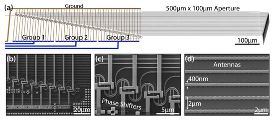 In 2016, C.V. Poulton et al., from MIT produced a phased array composed of 50 grating-based antennas [41]. The device achieves a 2D beam steering range of 46° × 36° by thermal and wavelength tuning, and the minimum beam spot is 0.85° × 0.18°. A schematic diagram of the device is shown in Figure 10. The phase shifters are cascaded into three groups. This design allows phase fine-tuning to compensate for noise caused by manufacturing errors. In addition, the cascade structure also allows three sets of phase shifters in the device to operate under different voltage conditions to generate three beams with different directions. In this research group, the antenna was etched on the edge of the waveguide using full etching, as shown in Figure 10b. This method can reduce the negative impact on the transmitting antenna caused by transition etching or insufficient etching of the waveguide.
