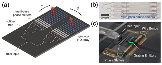 - Hutchison, D.N.; Sun, J.; Doylend, J.K.; Kumar, R.; Heck, J.; Kim, W.; Phare, C.T.; Feshali, A.; Rong, H. High-Resolution Aliasing-Free Optical Beam Steering. Optica 2016, 3, 887–890. [Google Scholar] [CrossRef]