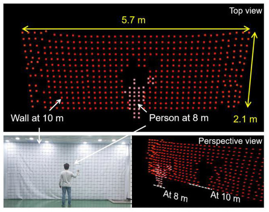 In 2021, C.S. Im et al. proposed an optical phased array with silicon nitride mixed polymer integration [49]. Unlike the traditional silicon nitride phased array, this polymer has a high thermal and optical effect. The device integrates the polymer phase modulator with the silicon nitride power distributor and antenna to solve the problem of low phased array modulation efficiency of silicon nitride materials. In addition, a steering angle magnifying lens is used to improve the modulation efficiency of the antenna. The test results show that the modulation power of each channel of the optical phased array is Pπ = 2.5 mW, and the field of view angle of 12° × 30° can be achieved. Finally, the research group combined this OPA to further produce the 3D Lidar based on ToF, and realize the scene scanning within 10 m. As shown in Figure 15, it is evidently found that a person at a distance of 8 m is distinguished from a wall at a distance of 10 m.