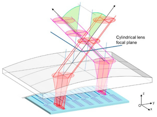 In 2018, C. Chaintoutis et al., from the University of Athens, proposed to realize two-dimensional steering of light beams by means of wavelength tuning and piezoelectric transducers [57]. In order to minimize the divergence of the pixel-transmitted beam, the research group added a lens system on this basis, that is, a cylindrical lens was added in front of the chip to ensure beam collimation for more than 20 m, as shown in Figure 16. The beam steering in the horizontal direction is accomplished by the phase shifter relying on piezoelectric transducers (PZT) with low power consumption () and high response time (ns). It is proven that the system can meet the requirements of low power consumption and low delay.