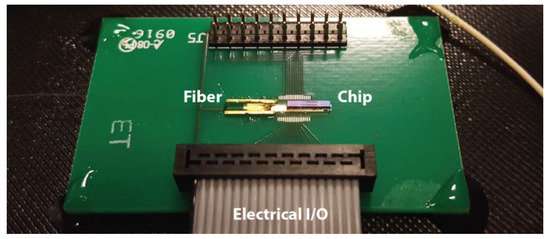 In 2021, X. Cao et al. proposed an FMCW Lidar based on lens-assisted beam steering [68]. The device consists of an integrated SiO2 1 16 switch chip, a 4 4 fiber optic array, and a lens, as shown in Figure 25a. Figure 25b shows the SiO2-based chip encapsulating the input and output of the single-mode fiber. The waveguide transmission loss is less than 0.05 dB/cm, ensuring adequate output and a long-ranging distance. Figure 25c shows the physical package diagram of the device. The Lidar operates at a 1550 nm, has 16 scan points, a steering step size of 0.35, a steering angle of 1.05, and a ranging distance of 80 m. The number of scanning points and scanning angles can be further increased by adjusting the parameters of the transmitting array and lens. This device demonstrates the potential of 2D lens-assisted beam steering Lidar in FMCW ranging.