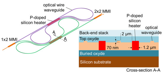 In 2009, A. Densmore et al. designed an optical switch array device that can reduce thermal and optical power consumption by taking advantage of the small bending radius realized by silicon photonic waveguides [56]. Compared with the traditional waveguide arrangement, the team constructed the waveguide into a double spiral structure, allowing the device to extend the waveguide length to achieve a larger range of phase migration without increasing the volume of the heating parts. This method not only reduces the power consumption of the thermo-optical switch but also reduces the volume of the whole device. In addition, the device does not need to minimize the width of the heater to achieve lower power consumption, increasing the manufacturing tolerance of the heater. The test results show that a low switching power of 6.5 mW was obtained for a spiral-path Mach–Zehnder interferometer device with a 10–90% rise time of 14 µs.