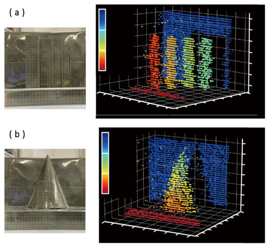 In 2022, T. Baba et al. proposed a silicon optical FMCW Lidar chip based on a slow light-grating (SLG) scanner [69]. The research group has achieved a two-dimensional scanning angle of 40 × 8.8° and a beam divergence of 0.1. The FMCW Lidar based on SLG can realize point cloud image acquisition of 4928 points within 3~5 m, and the result of point cloud acquisition is shown in Figure 26. Figure 26a is the point cloud image of four rectangles with different distances, and Figure 26b is the point cloud image of a circular vertebra.