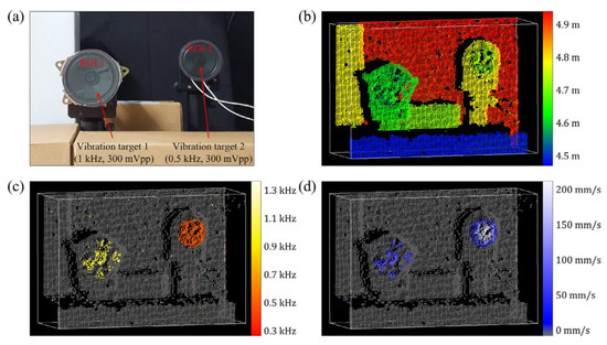 (a) Photograph of 3D visualization targets. (b) Measured image of the distance, (c) vibration frequency, and (d) maximum vibration velocity change [30].
