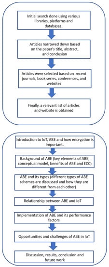 Survey method: To identify issues related to encryption, security, and privacy using ABE and its various aspects, a review was performed by selecting relevant articles through a screening process. The search for articles was conducted using keywords such as “Attribute-based Encryption”, “Fine-grained access”, and ”Internet of Things” in various databases, including Google Scholar, Research Gate, Web of Science, and Scopus. Initially, many articles were selected. In the second search, articles were narrowed down according to title, abstract, and conclusion. Finally, articles were selected based on recent journals, book series, conferences, and websites. The screening process and review methodologies are highlighted in a schematic diagram presented in Figure 1. Research papers were selected on the basis of the ABE scheme even if they were not suitable for IoT applications, but there are still a few exceptions []. Some of the papers were excluded even after ABE was mentioned in them due to (i) the scheme was obsolete compared to others, and (ii) there was no security proof. In this way, research papers were shortlisted for further analysis in this survey. The authors meticulously analyzed and discussed the collected information related to ABE and IoT, as well as future research work from the selected articles.
