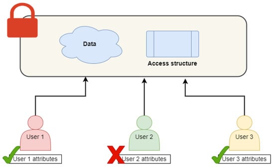 ABE was constructed for improved security and access control []. It is an advanced cryptographic method that removes the shortcomings of old public key cryptography and has no restriction on the number of users. These factors have been taken into account when developing this method, as it uses attributes as an access policy to control users’ access to cloud data. The entities used for the implementation of ABE are the sender, who owns the data, the receiver, who uses the data, and a key generation authority for the encryption and decryption of data. Some policies known as access policies (APs) are also created, which are responsible for the decryption of data at the receiver end, where only the authorized user with the required attributes can decrypt the ciphertext.