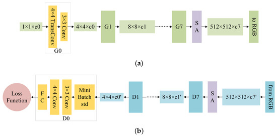 In this paper, a defect image generation network model named DG-GAN was proposed, which contains two generators G and C with the same structure, and four discriminators , , , and with the same structure. The DG-GAN network structure is illustrated in Figure 1. Among them, both the generator and discriminator adopt the idea of progressive generation antagonism [38], and a self-attention mechanism module is introduced into the high-resolution generator and discriminator layer [39]. The network structure of the generator and discriminator is shown in Figure 2. The network starts with a 4 × 4 resolution image and generates 8 × 8 and 16 × 16 resolution images step-by-step until it finally produces a 512 × 512 resolution image. The generator G has two functions: one is to generate a pseudo-defect image based on a true defect-free image f, and the other is to generate and reconstruct a pseudo-defect image based on a pseudo-defect-free image . The generator C also has two functions, with one being to generate a pseudo-defect-free image according to the real defect image i and the other being to generate and reconstruct a pseudo-defect-free image according to the pseudo-defect image . The function of the discriminators and is to distinguish the pseudo-defect-free image from the real defect-free image f, while the function of the discriminators and is to distinguish the pseudo-defect-free image from the real defect-free image i.