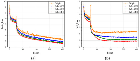 This paper employed the true original defect image and a varying number of generated false defect images to train and compare a detection model. The final training loss and validation loss of different training sets are shown in Figure 8. It can be observed that using more pseudo-defect images could make the training more stable, and the use of more datasets generating pseudo-defect images could alleviate the overfitting phenomenon of the model and make the training of the model more stable. The first row of Table 5 shows the detection accuracy index under different numbers of NEU-generated datasets, thus demonstrating that using more generated data can improve the detection accuracy of the model.