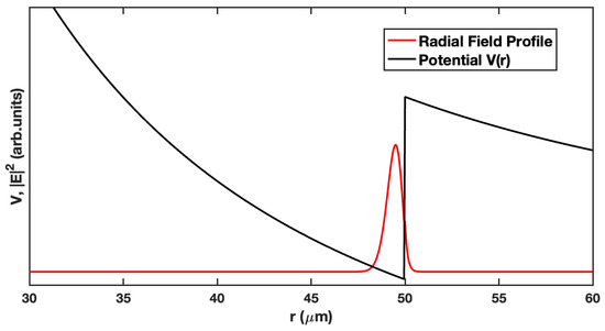 This is illustrated in Figure 1, which shows the potential well (Equation (3), black curve) and a first-order radial mode (red curve) for an air-clad microsphere (a = 50 m) with a size parameter a = 394.439, a refractive index n = 1.46, and an angular mode number ℓ = 575.