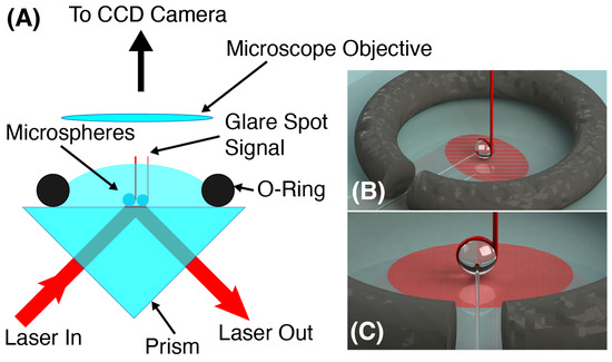 Since we are ultimately targeting biological analytes, we must form a vessel to contain the sample solution. The sample is held fixed over the illuminating spot with an o-ring that sits atop the prism surface [38]. A gap is cut into the o-ring to permit the microspheres, held in place by the fiber stem, to be positioned above the TIR spot, while surface tension prevents the solution from leaking out of the o-ring container. Figure 2B,C shows renderings of a single microsphere within the sample volume bound by an o-ring. The fiber stem, which allows for the easy positioning of the microsphere, is clearly visible in these renderings. The red band around the sphere and the red tube tangential to the edge represent light circulating in the WGM and the glare spot signal, respectively.