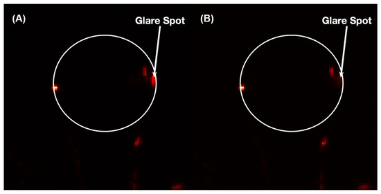 A microscope was positioned above the prism surface, where one or several microspheres were located within the sensing region. The tunable DFB laser light couples to the microsphere, resulting in photons being injected into the resonant modes. As this light circumnavigates the microsphere, it slowly leaks out tangential to the surface [39,40]. The leakage at one edge of the microsphere is directed upward towards the microscope (Figure 2), which is collected and imaged onto a CCD camera. The image of the microsphere shows a bright “glare spot” on the edge that varies in intensity as the laser is tuned through WGM resonances. Figure 3 shows images of a prism-coupled microsphere at two different times in the tuning cycle. Figure 3A is on-resonance and shows a bright glare spot due to the leakage from the circulating resonant light. Figure 3B corresponds to the off-resonance condition and one can see that the glare spot intensity is significantly diminished. Such glare spots may be used to perform spectroscopy within droplets [41], but, in this case, the spectral signature of the microsphere is determined by monitoring the intensity of these spots. A wide field of view allows multiple microspheres to be located within the beam spot on the prism surface and monitored simultaneously, i.e., spatial multiplexing.
