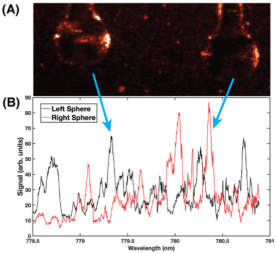 The spectra obtained from the two spheres in Figure 4A are shown in Figure 4B. The spectrum from the left sphere (black curve) shows several prominent peaks within the tuning range. The spectrum from the right sphere (red curve) also has a number of prominent peaks, along with a couple of peaks that appear narrow. Some overlap of resonance modes from the two different microspheres is observed. The spatial multiplexing imaging approach has the advantage of being able to discriminate the different modes, unlike the serial configuration. If the microspheres were inline on a bus waveguide, then their spectra would confound each other, making discrimination and sensing difficult. Even if resonances were associated with specific microspheres a priori, once analytes interact with the evanescent field and the resonances shift (Equation (4)), the WGMs could/would move through each other, prohibiting accurate measurements.