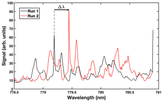 Resonance spectra from a single 250 m diameter sphere immersed in water (Run 1, black) and then a water/methanol solution (Run 2, red). The change in the bulk refractive index surrounding the sphere results in a ∼0.26 nm shift in the WGM resonances. For clarity, an arrow indicates the shift in one of the resonances. Videos of the two runs, in which the sphere is observed to resonate as the laser is tuned, may be downloaded from the Supplementary Materials.