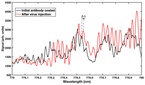 In addition to monitoring changes in the bulk solution, the whispering gallery mode biosensor has been used to detect the adsorption of target biomolecules. Figure 6 shows the WGM resonance spectrum (black curve) of a microsphere coated with antibodies that bind to Human Papillomavirus (HPV). Shortly after this spectrum was recorded, a 1 L solution of HPV, which the antibodies were designed to bind with, was injected into the sample volume and allowed to diffuse to the microsphere. The specific binding events altered the resonance condition of the system, resulting in a shift in the resonance peaks. In essence, the virus “grows” a layer over the surface of the sphere, effectively increasing the size of the sphere so that, in order to remain on resonance, the mode wavelength shifts to longer values. The red curve shows the WGM resonance spectrum approximately 5 min post-injection. At this point in time, the resonances have shifted 0.12 nm due to the binding of the virus to the antibodies on the surface, in accordance with the RSP (Equation (4)). For clarity, an arrow indicating for one resonance is shown in Figure 6. The shift in this spectrum is smaller than that observed in Figure 5, owing to the thin layer of viral material aggregating on the surface of the microsphere.