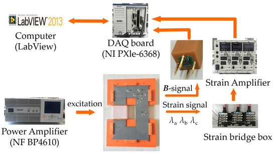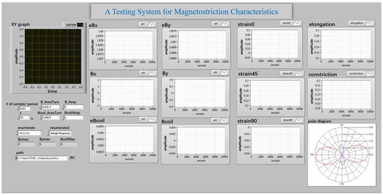An overview of a single-phase transformer core testing system is illustrated in Figure 2, which shows the experimental setup of localized magnetic characteristics and magnetostrictive strain measurement, in which a power amplifier is used to supply the windings of the transformer core with an alternating current (ac) or an ac with DC common excitation. The localized magnetic signals are measured by a self-developed B-H vector sensor. The magnetostrictive strain is measured from the resistance strain gauge, KFG-5-120-D17-11, which is attached to the surface of the core to obtain in-plane magnetostriction in any direction; then, they are transferred to a LabVIEW program through a data acquisition board to be processed. The program interface of magnetostrictive testing is illustrated in Figure 3.