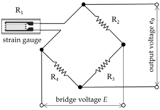 When the strain gauge is used alone, considering that the resistance variation caused by the strain gauge is very small, voltage detection needs to be completed by a Wheatstone bridge, as shown in Figure 4. The resistances on the bridge are R1, R2, R3, and R4 (Ω). When the bridge voltage is E (V), the output voltage e0 (V) is