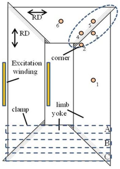 The 2-limb, 1-phase transformer core is stacked from 12 layers of grain-oriented electrical steel sheets. The core size is 385 mm × 250 mm and the widths of both the yoke and limb are 90 mm. A multistep-lap construction of four steps is employed. The six measurement points “1–6” of interest are distributed on the yoke, limb, and corner of core, as shown in Figure 5.