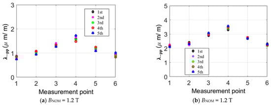 In order to minimize measurement uncertainty, the magnetostrictive strain signals at each point of interest on the cores in Figure 5 are repeated five times, and Figure 6 shows the measurement results of principal strain λ−pp repeated 5 times when the nominal inductions of BNOM = 1.2 T and BNOM = 1.7 T are applied. The average values of λ−pp at six measurement points at BNOM = 1.7 T are 2.19 μm/m, 2.37 μm/m, 2.98 μm/m, 3.46 μm/m, 2.77 μm/m, and 2.22 μm/m, and the maximum measurement deviation is about ±0.30 μm/m. From Figure 6, we observe that the strain values in each region increase with the increase in magnetization strength. Moreover, the strain at “point 3–5” is larger than those at the limb and the yoke due to the rotational magnetic flux density occurring at the corner of core, which induces more strain. The existence of a rotating magnetic field is explained in Section 3. Another reason is that the attractive forces are caused by the inter-laminar off-plane flux close to air gaps.