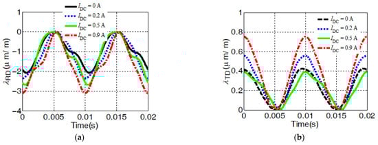 Figure 7 discusses the influence of DC bias on the magnetostrictive strain of the core. In this paper, the direct current IDC is applied along the same side as the sinusoidal excitation source Iac, which may reflect the fact of DC bias caused by the monopole earth return of GIC or HVDV. The magnetizing current in the winding is imposed with a DC component of 0.2 A, 0.5 A, and 0.9 A, respectively.