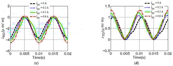 Figure 7a–d indicate measured strain waveforms in one magnetization cycle along both the RD, λRD, and the TD, λTD, with a DC bias magnetic field when the core is magnetized at 1.7 T. The strain of the magnetostriction in the transform core varies periodically twice within a 0.02 s magnetization period. The strain along the RD exhibits contractive strain and the strain along the TD is positive with the property of elongated strain. The contractive strain λ−pp is always greater than the elongation strain.