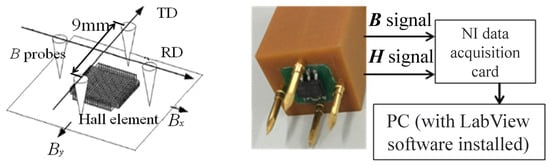 where is the measured induced voltage value and subscript i = x or y represents two orthogonal measurement directions; NBi is the equivalent number of turns of the probe. Since the probe measures the voltage on one side of the closed loop, which is equivalent to a half-turn coil, NBi = 1/2; SBi is the effective area of the measuring area of the probe, which is equal to the product of the distance between the relative probes and the thickness of the sample to be measured. T is the period. The magnetic flux density value obtained from Equation (9) is