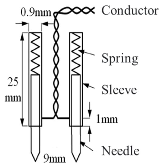 Figure 8 illustrates the configuration of the B-H vector sensor. The sensor has two sets of B probes made from non-magnetic material for measuring the induced emf eB across the probes. The spacing between the probes is 9 mm and there are hard pins on the end of the probe enough to pierce the insulation coating of the electrical steel sheet to achieve good electrical contact during the measurement. The construction and connection method of the probe are shown in Figure 9, which consists of a sleeve, needle, and spring. The spring supports the needle and is fixed inside the sleeve. During the measurement process, the needle is fully retracted into the sleeve. The needle is made of non-magnetic material and non-magnetic steel, with a relative permeability of 1.0002, which does not affect the measured magnetic field. The probe tip is machined into a triangular cone shape by high-speed rotation of a grinding wheel, which can penetrate the insulation coating of electrical steel sheets and achieve good electrical contact. A wire to the other end of the probe is connected for signal extraction, and the wire is wound into a spiral shape to reduce the impact of stray magnetic flux on the measurement results.