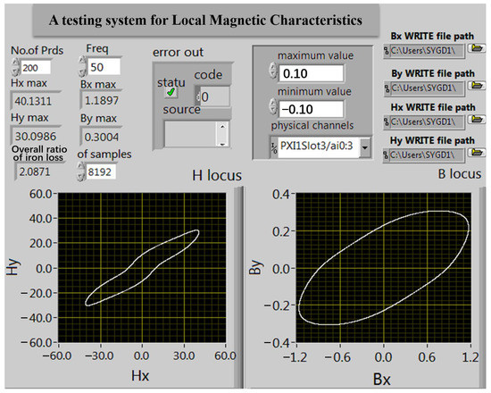 Data storage and loss calculation module part: Based on Formula (12), the obtained Hx, Bx and Hy, By signals are obtained through the specific loss calculation subroutine to obtain the specific loss values in the x and y directions, and finally, the total specific loss values are added. At the same time, in order to facilitate the post-processing of measurement data, a data storage module is added to this part, which stores magnetic field intensity signals Hx, Hy and magnetic flux density signals Bx, By after the program is finished.