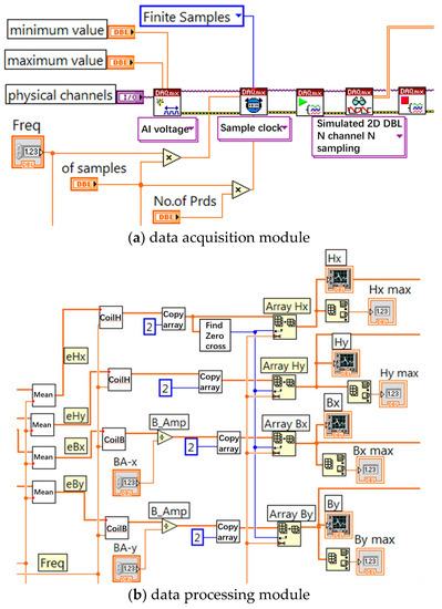 Data acquisition section: In this part, the DAQmx Create Virtual CHannel analog voltage input channel of the acquisition card and four virtual channel paths collect eHx, eHy, eBx, and eBy signals. First, the maximum voltage allowed through is set to ±10 V. Then, the DAQmx Timing module is called to select the limited sampling mode with the frequency set at 50 Hz and the sampling number at 8192. The DAQmx Start Task module program is called to start data collection. Next, the DAQmx Read module is called to read the data collected in the four channels. Finally, the DAQmx Clear Task module is called to clear the task. This part also adds the program error prevention function, when the program running error will be timely displayed and will stop the program running.