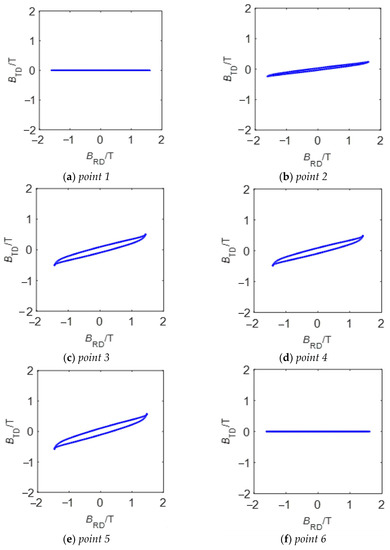 Figure 12 shows the measured B trajectories at “point 1–6”. The alternating magnetizations are presented at “point 1” and “point 6” in the yoke and limb, while the rotational magnetization mainly occurs at “point 3–5” of the corner.
