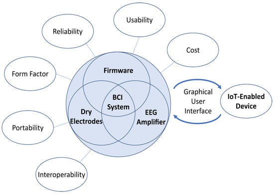 Prior efforts from the scientific, engineering, medical, regulatory, industrial, and patient-advocate communities [23,24,25,26] have addressed the challenges and opportunities for accelerating the translation of closed-loop BCI systems for medical applications. Some of the key challenges identified in deploying these technologies to end-users include usability, interoperability, accessibility, and mobility, as well as the lack of standards (device, performance, clinical, and end-user metrics). For example, current commercial EEG amplifiers and BCI headsets are prohibitively expensive, lack interoperability, or fail to provide a high signal quality or closed-loop operation, which are vital for BCI applications [23]. To address these challenges and facilitate the translation of BCI systems, we adopted criteria derived from the above stakeholder meetings for the design of closed-loop BCI systems (Figure 1). Next, we briefly review these criteria. The reader is referred to the source publications from these stakeholder meetings for additional details.