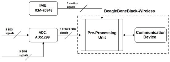In EEG systems, an instrumentation amplifier acts to increase the amplitude of the detected signal to a level that can be further processed while an input buffer amplifier eliminates the need for impedance matching. Recently, the term amplifier has been broadened to also include the digitization of the analog signal through an analog-to-digital conversion (ADC) chip, wireless communication, and motion-detection system. In the proposed BCI system, there are three main components on the amplifier board: signal amplification, analog-to-digital conversion, and motion sensing. Following the ADC step, it is necessary to pre-process the signals before transmission to the processing unit. These steps are summarized in Figure 3.