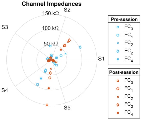 The impedance values from all electrodes were collected before and after the open-loop BCI test. The beginning and final impedance values for each electrode are presented in Figure 5. For all but two electrode impedance measurements, the electrode impedance values remained under 100 k and for most electrodes they remained under 50 k.