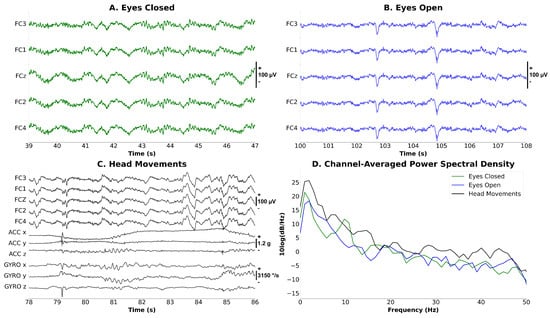 Since the early 1960s, when electroencephalography (EEG) data were first digitized and processed with a computer to today, much progress has been made in harnessing the potential of brain–computer interface (BCI) applications [1,2]. While EEG measurements are affected by many factors, including physiological and non-physiological artifacts [3] resulting in low signal-to-noise ratios [4], recent advancements in de-noising (e.g., [5,6]) and deep learning [7,8] techniques have driven the emergence of viable clinical and non-clinical BCI applications based on scalp EEG [1,2,9]. These applications include, but are not limited to, seizure state prediction [10,11], sleep stage analysis [12], cognitive workload assessment [13], motor-imagery-based brain–computer interface (BCI) systems [14,15], neurorehabilitation [16,17], multi-modal and multi-brain–computer interfaces [18], brain-controlled vehicles [19], EEG-based home control [20], virtual reality [21], and interactive virtual environments [22]. While the future of these proof-of-concept BCI-enabled applications is promising, there are a number of technical challenges that remain before the widespread translation and adoption of these systems is realized.